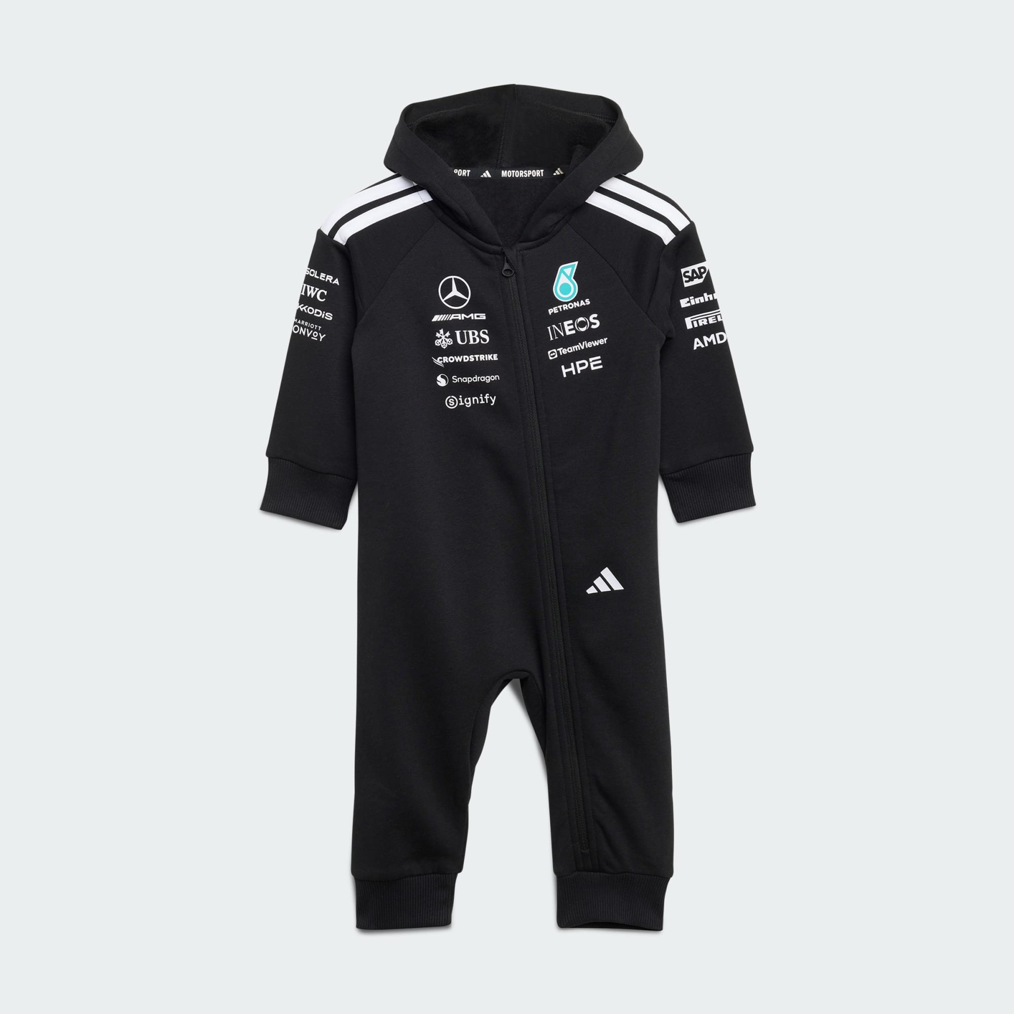 Introducing the Mercedes - AMG Petronas Formula 1 Team DNA Baby Suit, where the thrill of motorsport meets the comfort of everyday wear for even the tiniest fans. The regular fit allows your little one to move and explore, while the soft fleece is warm and comfortable. The modern 3-Stripes add a touch of iconic adidas style. The zip closure makes dressing easy, allowing for quick changes without fuss. Whether it's for a day at the park or a family outing, this suit is designed to be comfortable and stylish.