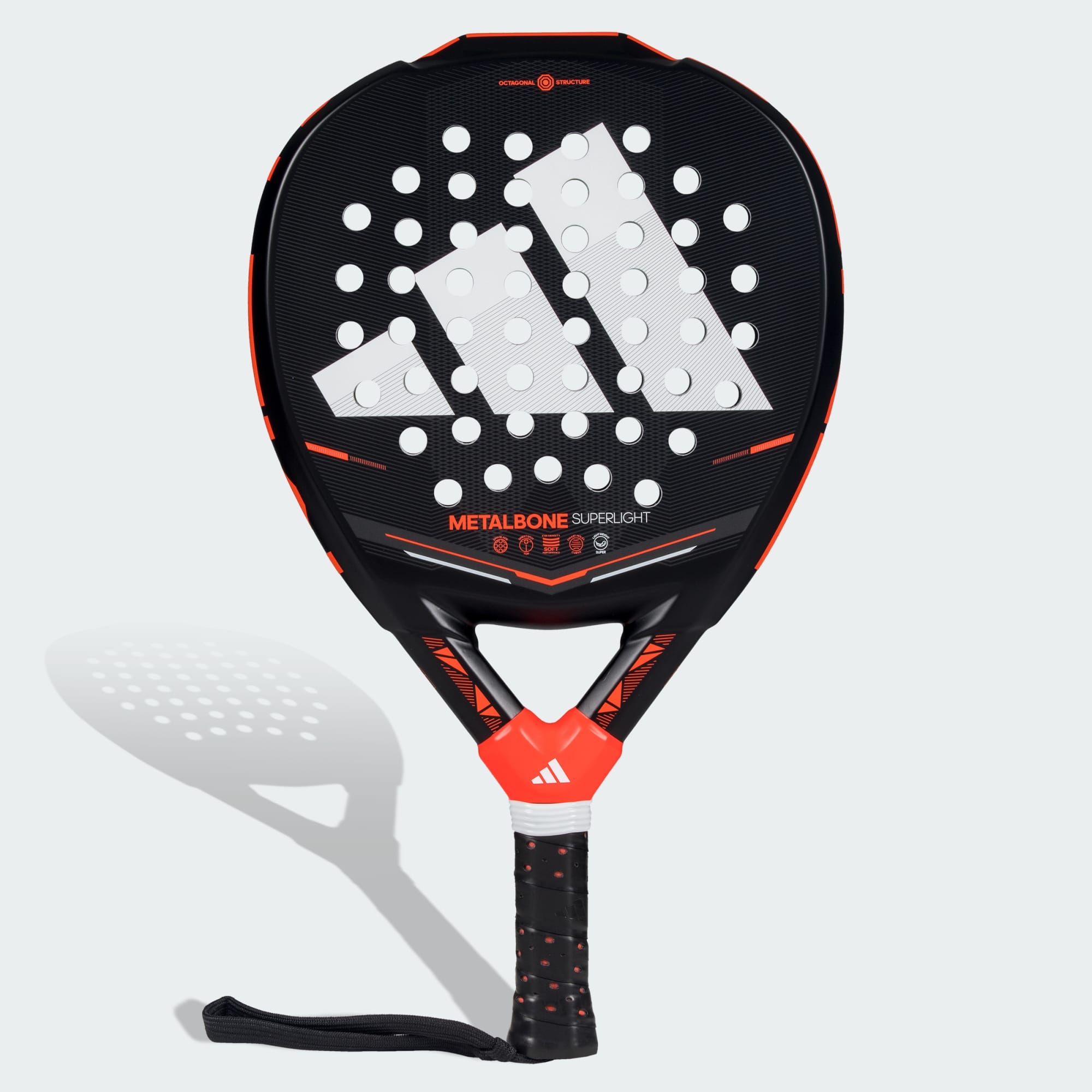 The adidas Metalbone Superlight Padel-Racket is a lightweight racquet to support learning. Designed for players who are just starting to discover the sport. Its diamond oversize format combines a high balance with a larger hitting surface. The fibreglass construction offers soft touch and consistent ball output. The low-density EVA rubber adds to the comfort, while the curved smart holes favour generation of spin in different types of shots. The carbon tubular structure, with a carefully designed octagonal section, reduces torsion for precise shots. The reinforcements located around the perimeter provide resistance, making this padel racquet your reliable companion.