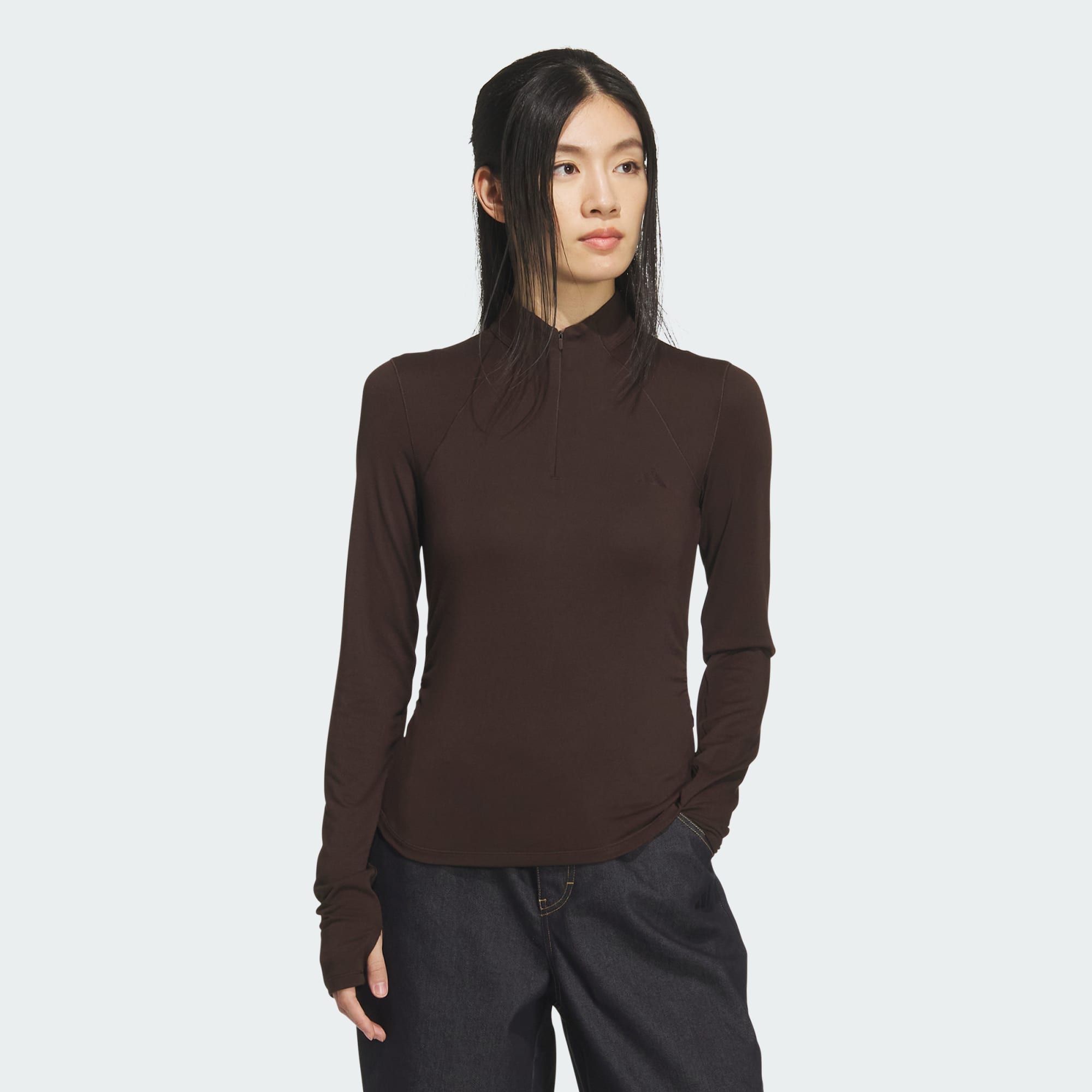 Designed with care, our Slim Long Sleeve Tee is a versatile layer with a sleek silhouette. Offering a soft touch against the skin, the slim fit provides classic comfort. With a short length and a half zip, this t-shirt can be worn as a chic layer or standout solo piece. The gathered waist and curved hem highlight our attention to the finer details. The concealed zip provides a clean look, while thumbholes add styling options for cooler days. With an iconic 3 Bar Logo print for authenticity, this t-shirt embodies adidas style.