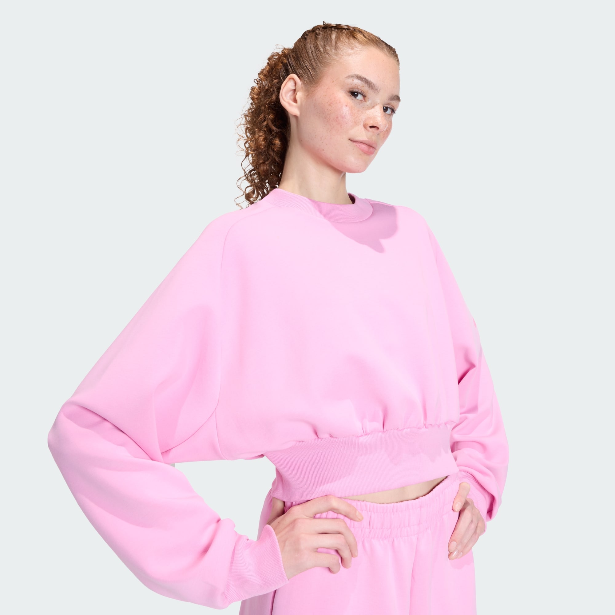 In this adidas sweatshirt, comfort and style are one. Slip into its soft yet lightweight fabric and let its loose, leisurely fit give you room to move. Raglan sleeves lend a sporty look, perfect for pairing with joggers or leggings.