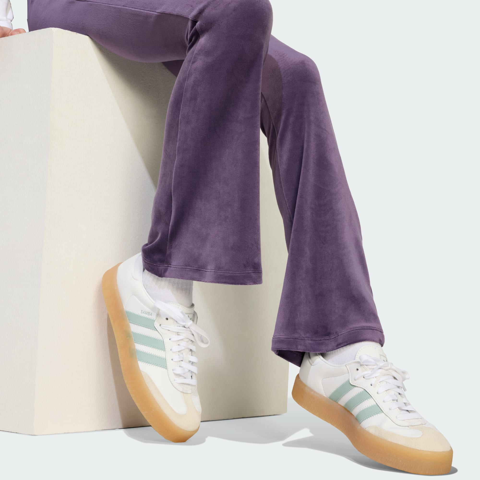 These juniors' adidas pants are made to be seen. The velour material is soft and plush, perfect for cosy days in or nights out. Pair them with your favourite cropped tee and oversized denim jacket for an effortlessly cool look. An embroidered Trefoil on the leg adds a subtle nod to sporty style.